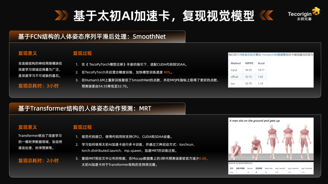 考慮到全連接網(wǎng)絡(FCN)在人工智能領域的基礎性地位,王濤首先復現(xiàn)了基于FCN的人體姿態(tài)后處理算法SmoothNet。得益于TecoPyTorch框架優(yōu)秀的接口適配,王濤僅更改了幾行代碼就將基于CUDA設備的代碼遷移到了SDAA設備上,完成了SmoothNet pipeline的復現(xiàn)。進一步,他在TecoPyTorch上開啟了混合精度訓練,成功將模型訓練速度提升了40%。最終,復現(xiàn)模型不僅達到了官方基準性能,更在部分指標上超越了原論文報告的結(jié)果,充分展現(xiàn)了太初AI加速卡在硬件和軟件層面的卓越計算精度。