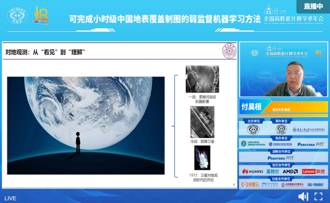清華大學(xué)地球系統(tǒng)科學(xué)系長聘教授,國家超級計算無錫中心副主任付昊桓在主題講演中基于對新一代神威超級計算機的應(yīng)用,討論了有關(guān)地表覆蓋制圖的一種高可擴展的弱監(jiān)督分類方法,無需額外的人工標注,即可完成大尺度的地表覆蓋任務(wù)。