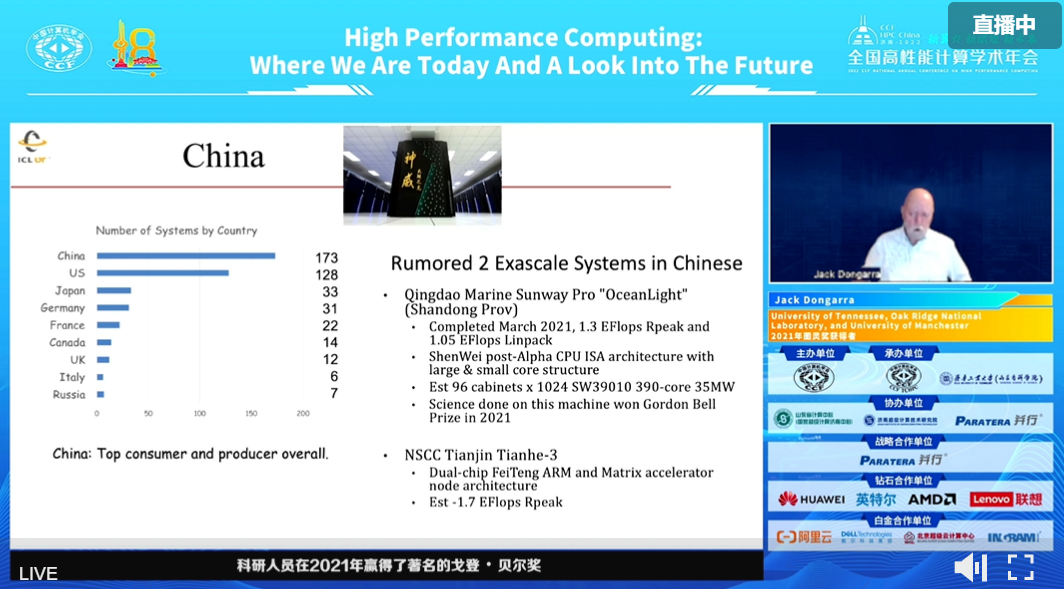 2021圖靈獎獲得者、田納西大學(xué)、橡樹嶺國家實驗室和曼徹斯特大學(xué)教授Jack J. Dongarra在報告中分享了高性能計算在過去10年里發(fā)生的變化,以及未來的趨勢可能會是什么,其中特別提到由清華大學(xué)、無錫超算等團隊所構(gòu)建的“神威·太湖之光”軟件應(yīng)用生態(tài),已三次獲得世界超算應(yīng)用最高獎“戈登·貝爾獎”。