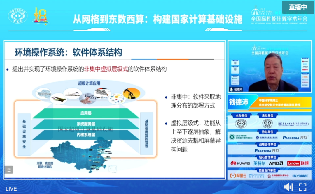 中國科學(xué)院院士、北京航空航天大學(xué)計算機學(xué)院教授、中國計算機學(xué)會會士錢德沛在主題演講中,著重介紹了國家高性能計算環(huán)境的實踐,總結(jié)了國家20多年來在高性能計算的超常發(fā)展,談到“超算應(yīng)該進一步提升其基礎(chǔ)設(shè)施形態(tài)?!?/span>