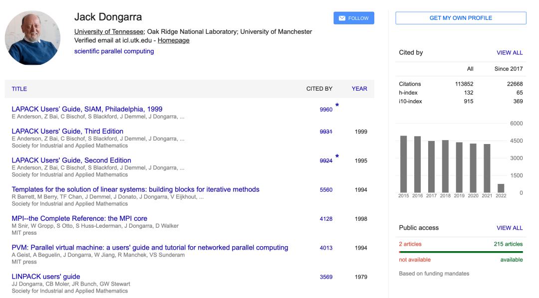 其中,2021年圖靈獎(jiǎng)獲得者,美國田納西大學(xué)、橡樹嶺國家實(shí)驗(yàn)室和曼徹斯特大學(xué)教授,超算TOP500排行榜創(chuàng)始人Jack Dongarra也將出席本次大會(huì)并作特邀報(bào)告。他的論文被引數(shù)超過11萬,h-index超過130。