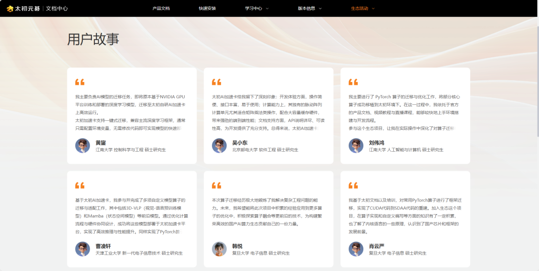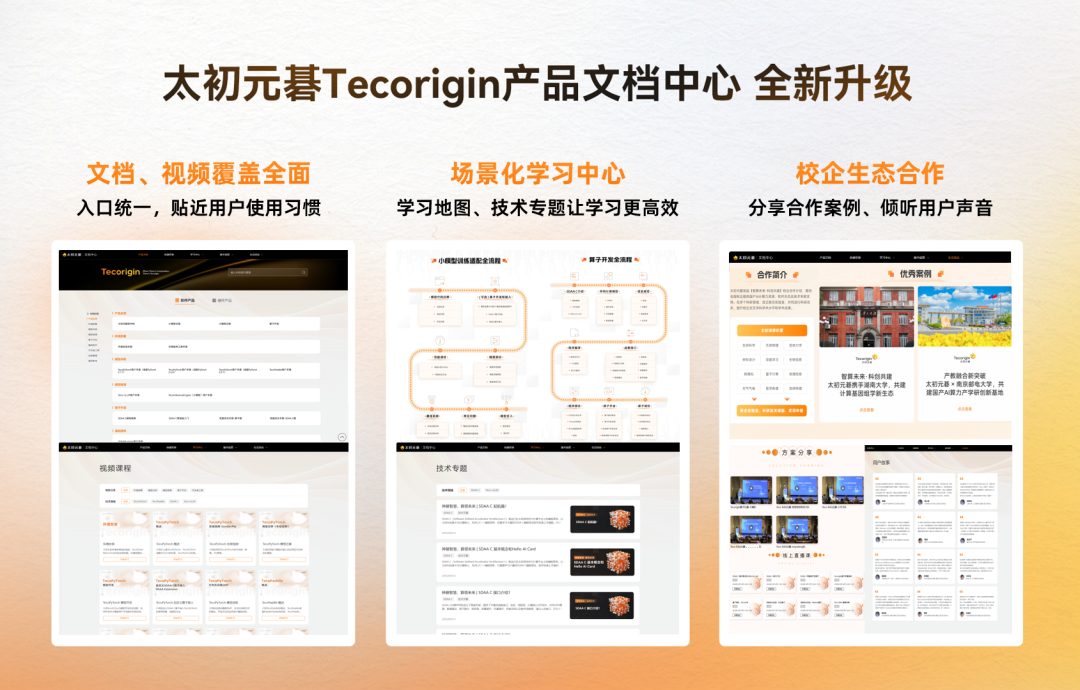 太初元碁產(chǎn)品文檔中心的此次升級(jí),圍繞 “從入門到進(jìn)階、從實(shí)踐到合作” 的全生命周期需求,構(gòu)建“資源、學(xué)習(xí)、合作 、互動(dòng)”的全鏈條賦能體系:統(tǒng)一入口整合 AI 開發(fā)全周期內(nèi)容,讓 “找資源” 更高效;場(chǎng)景化學(xué)習(xí)地圖與體系化技術(shù)專題拆解核心技術(shù),讓 “學(xué)技術(shù)” 更順暢;校企合作板塊打通產(chǎn)學(xué)研對(duì)接通道,讓 “促合作” 更直接;生態(tài)活動(dòng)與用戶故事板塊搭建生態(tài)交流平臺(tái),讓 “融生態(tài)” 更深入。