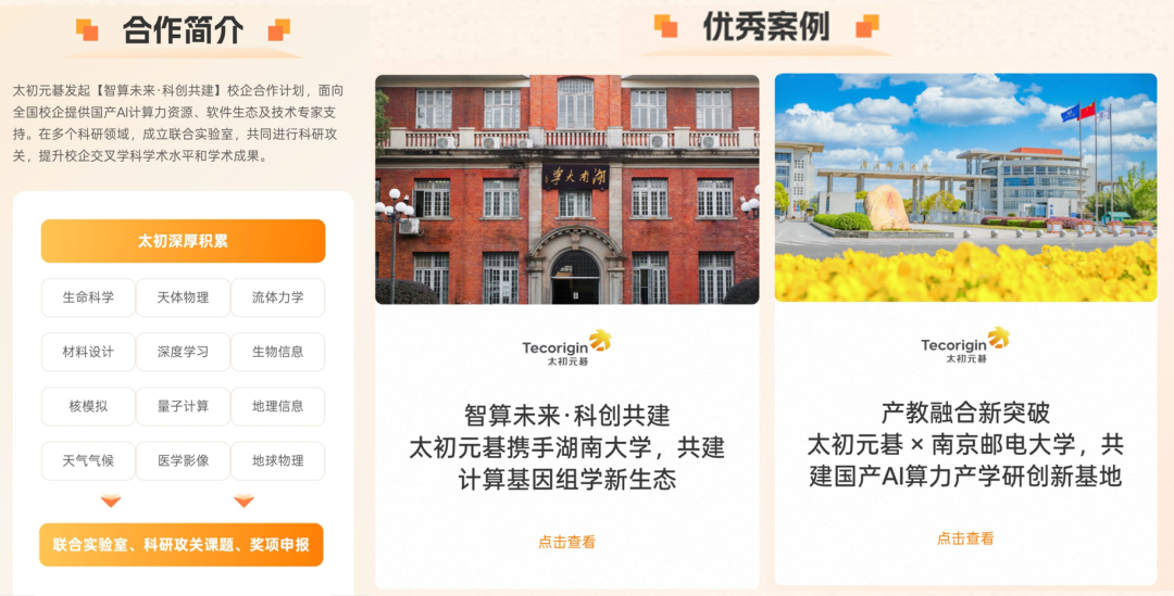校企合作板塊,以 “鏈接需求、共享價(jià)值”為核心,共建校企生態(tài)。該板塊系統(tǒng)展示太初元碁與校企科研合作的成果和案例,并開放一鍵合作申請(qǐng)入口,旨在高效對(duì)接技術(shù)需求,拓展合作場(chǎng)景,加速產(chǎn)學(xué)研協(xié)同落地。