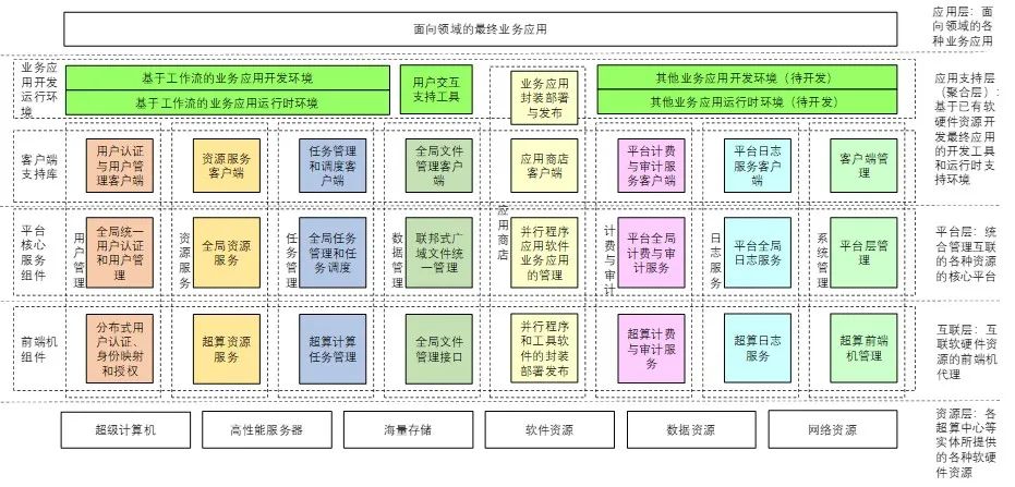 超算互聯(lián)網(wǎng)是指基于多個國家級超級計(jì)算中心的資源,通過高速網(wǎng)絡(luò)實(shí)現(xiàn)資源的互聯(lián)互通與資源共享,形成國家高性能計(jì)算核心資源網(wǎng)。其上集成了研發(fā)資源管理與任務(wù)調(diào)度軟件,形成領(lǐng)域應(yīng)用平臺搭建技術(shù)體系。并在復(fù)雜力學(xué)體系與量子物理體系、生物與材料、環(huán)境治理與災(zāi)害防治等多個重點(diǎn)領(lǐng)域進(jìn)行應(yīng)用資源集成與服務(wù)集成,建設(shè)領(lǐng)域應(yīng)用平臺并開展應(yīng)用示范,為國家實(shí)驗(yàn)室等大型研究機(jī)構(gòu)提供以數(shù)值模擬為主、兼顧數(shù)據(jù)分析和智能計(jì)算的科研基礎(chǔ)設(shè)施服務(wù)。